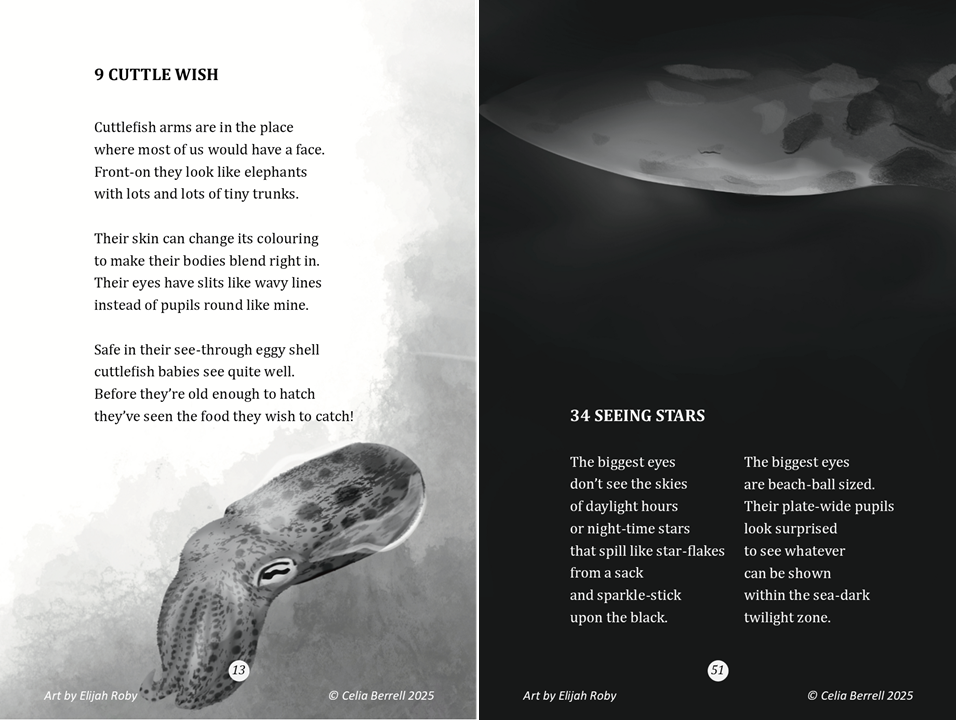 From splashy surface to secretive sea-floor, SCIENCE RHYMES IN THE SEA is a marine masterpiece of verse for children. On our poetic dive, we join baby sea turtles RIDING THE GULF STREAM; discover insights from IMMORTAL JELLYFISH then DIVE LIKE A WHALE before having DINNER IN THE ABYSS and finally encountering ZOMBIES OF THE DEEP. Familiar and little-known ocean creatures and environs reveal their quirky talents through Celia’s enjoyably informative poems, expertly enhanced by Elijah’s ambient artistry.