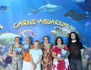 That’s when we celebrated the completion of the book SCIENCE RHYMES IN THE SEA at CAIRNS AQUARIUM. Dr Hilary Whitehouse (my JCU mentor), Diane Finlay (SCBWI FNQ coordinator), Celia Berrell (author), Sokar Philpot (project mediator), Sharne Lilly (project-made-possible coordinator) & Elijah Roby (illustrator) recited their chosen poems to the fish!